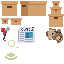 Boxes of different sizes, crumpled paper, newspaper, and packing tape dispenser.